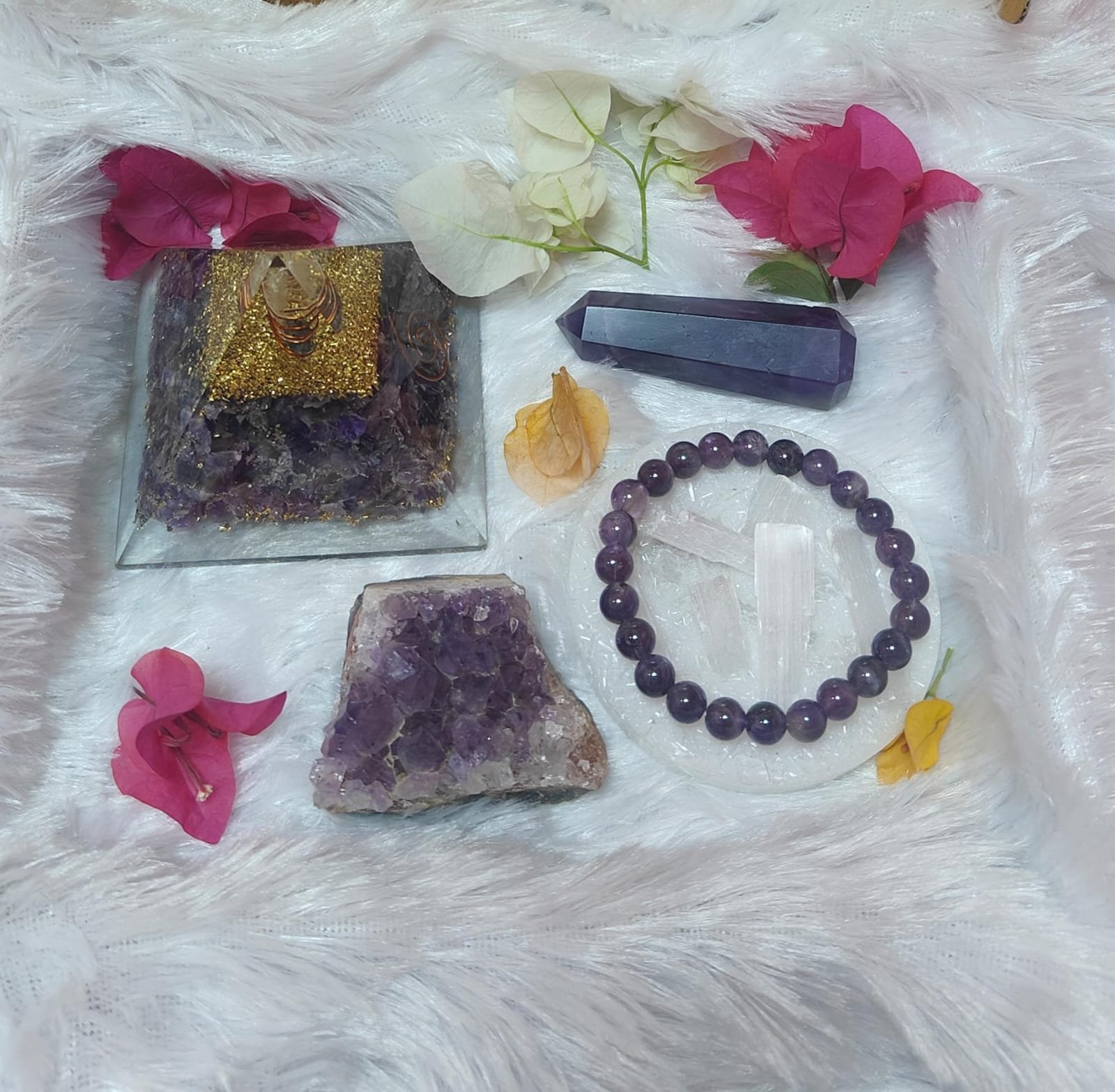 This powerful healing set includes an Amethyst Crystal Pyramid, Amethyst Bracelet, Amethyst Raw Cluster, Amethyst Tower, and Selenite Plate—each element working together to cleanse negativity, protect the aura, and elevate spiritual vibrations.