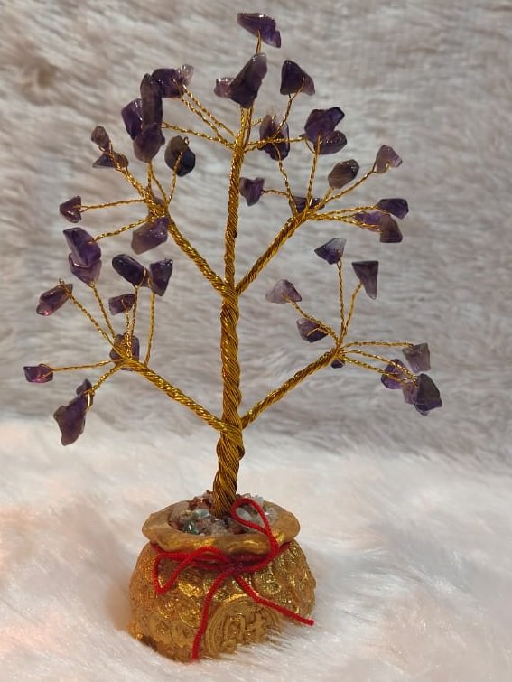 Handcrafted amethyst crystal tree set in a beautiful golden pot—perfect for bringing peace, positivity, and elegant décor to any space. Made with natural amethyst chips for calming, healing energy.